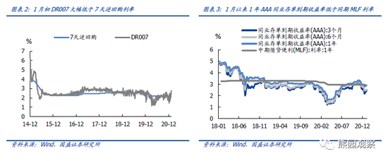 央行1月以来操作反映了维稳货币的意图。一方面,11月以来央行通过加大MLF和逆回购投放,以对冲永煤违约事件带来的影响,DR007一度低于7年逆回购利率;MLF投放也使得1年AAA同业存单到期收益率低于同期MLF利率。央行“地量”操作应是旨在引导市场利率向政策利率的回归。另一方面,违约事件冲击减弱,再考虑到2020Q4经济数据表现亮眼、已回到潜在产出水平,且后续可能面临温和通胀环境,央行也无进一步宽松的必要。