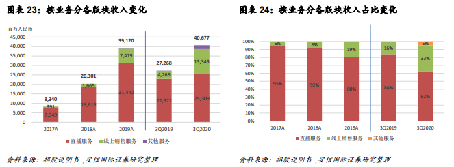 直播是快手最大的收入来源。直播电商GMV2019年达596亿,市场占有率14.3%。2017年、2018年、2019年及2020年9月30日止九个月,公司的直播收入占总收入的百分比分别为95.3%、91.7%、80.4%、62.2%,同比增速分别为134.2%、68.9%和10.4%。快手电商买家的平均复购率达到60%,2020年前三季度直播中平均每月付费用户数5990万人,而2019年同期是4850万人。