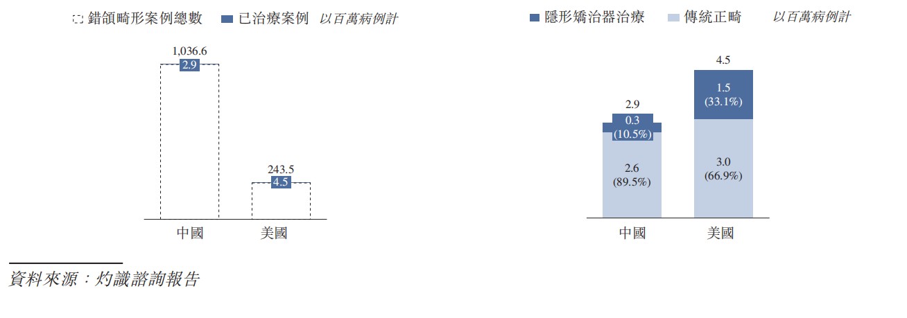 (数据来源:时代天使招股书)渗透率上,中国的隐形矫治市场目前仍处于起步阶段,相较于美国等发达国家而言,渗透率仍比较低。于2019年,在中国经治疗的2.9百万例错颌畸形病例中,仅10.5%采用隐形矫治器治疗,而在美国经治疗的4.5百万例错颌畸形病例中,33.1%采用隐形矫治器治疗,其中的差异进一步表明中国隐形矫治市场渗透率较低的事实。