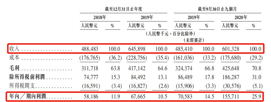 (数据来源:时代天使招股书)而比起快速的增长速度,令人瞩目的恐怕是它的毛利率水平。据招股书显示,2018年至2019年,该公司的毛利率分别为63.8%、64.6%,逐年提升;而经调整净利率期内则为18.9%、20.2%,亦不断提升。截至2020年前三季度,该公司录得毛利率为70.8%,录得净利率为33.9%,吸金能力可见一斑。