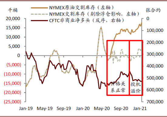 对WTI原油而言,我们剥离海上浮仓回流到岸的影响,岸上交易所库存和价格回归正常关系。同时,我们也发现,当前交易所非商业投机持仓预示着一季度83万桶/天去库存的市场预期,从我们的原油预测模型估计有5美元/桶左右的溢价。我们预计溢价主要来自沙特和伊拉克的口头承诺减产,以及此次去库存预期下的额外减产,短期可能还会上升。