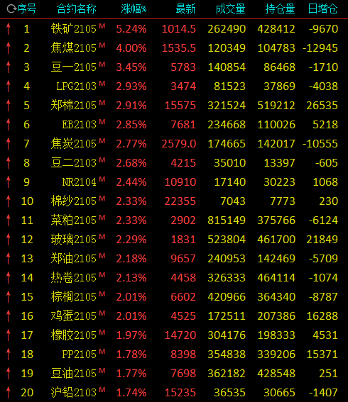 热点栏目2月5日,国内期市早盘大面积上涨,黑色系涨幅居前,铁矿石涨逾5%,焦煤涨4%,焦炭涨近3%,玻璃、热卷涨逾2%;能产品普涨,豆一涨逾3%,棉花涨近3%,豆二、菜粕、菜油、鸡蛋涨逾2%;能化品中,LPG、苯乙烯涨近3%;跌幅方面,沪银跌逾2%,乙二醇、沪金跌逾1%。