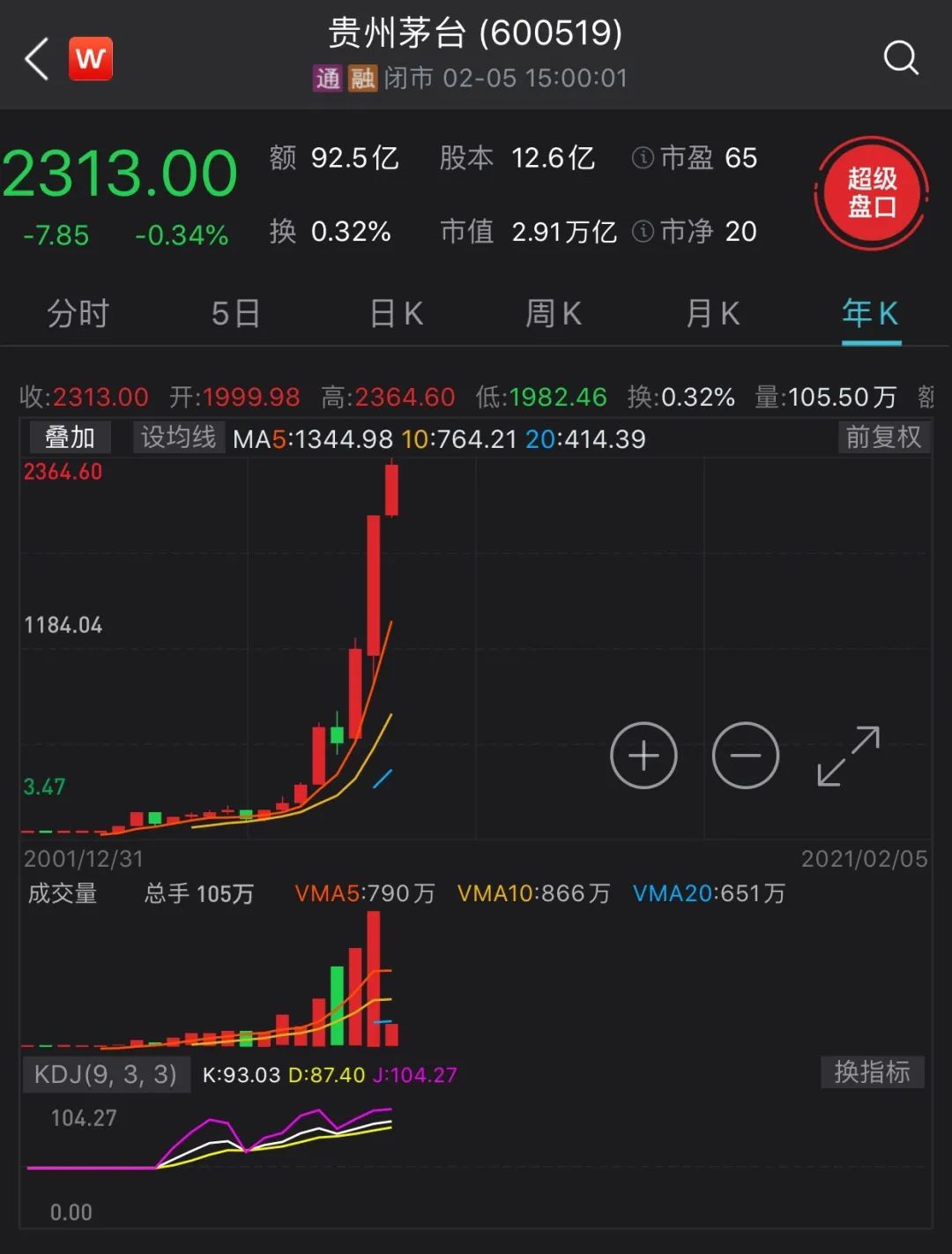 截至2020年2月5日收盘,贵州茅台报2313元/股,总市值2.91万亿,比老二工商银行足足多出1万多亿。