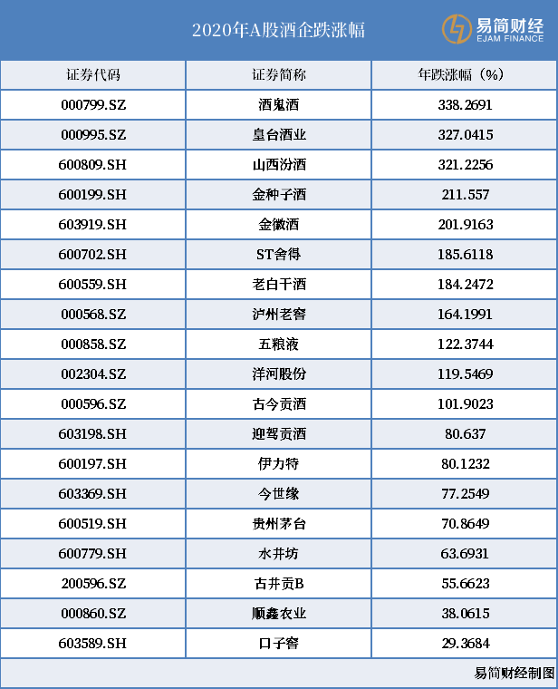 酒鬼酒、皇台酒业(维权)、山西汾酒三只个股去年涨幅超300%,金种子酒、金徽酒涨幅超过200%;ST舍得(维权)、老白干酒、泸州老窖、五粮液、洋河股份、古井贡酒的涨幅超过100%……