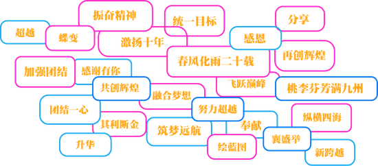 如果你在网络上搜索“年会主题”,会看到诸如此类的推荐:春风化雨二十载,桃李芬芳满九州;感恩、奉献、分享;激扬十年,筑梦远航;团结一心,其利断金;飞跃巅峰,纵横四海……