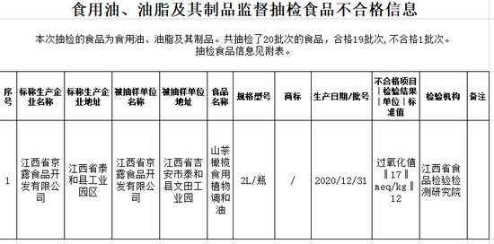 2、由江西省京露食品开发有限公司生产销售的山茶橄榄食用植物调和油,过氧化值不符合产品明示标准及质量要求。检验机构为江西省食品检验检测研究院。