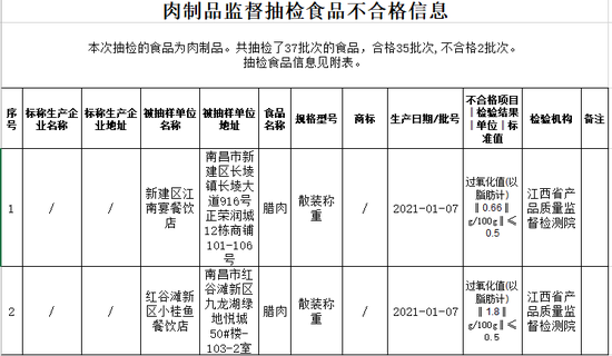 1、由南昌市新建区江南宴餐饮店销售的腊肉,过氧化值不符合食品国家安全标准规定。检验机构为江西省产品质量监督检测院。