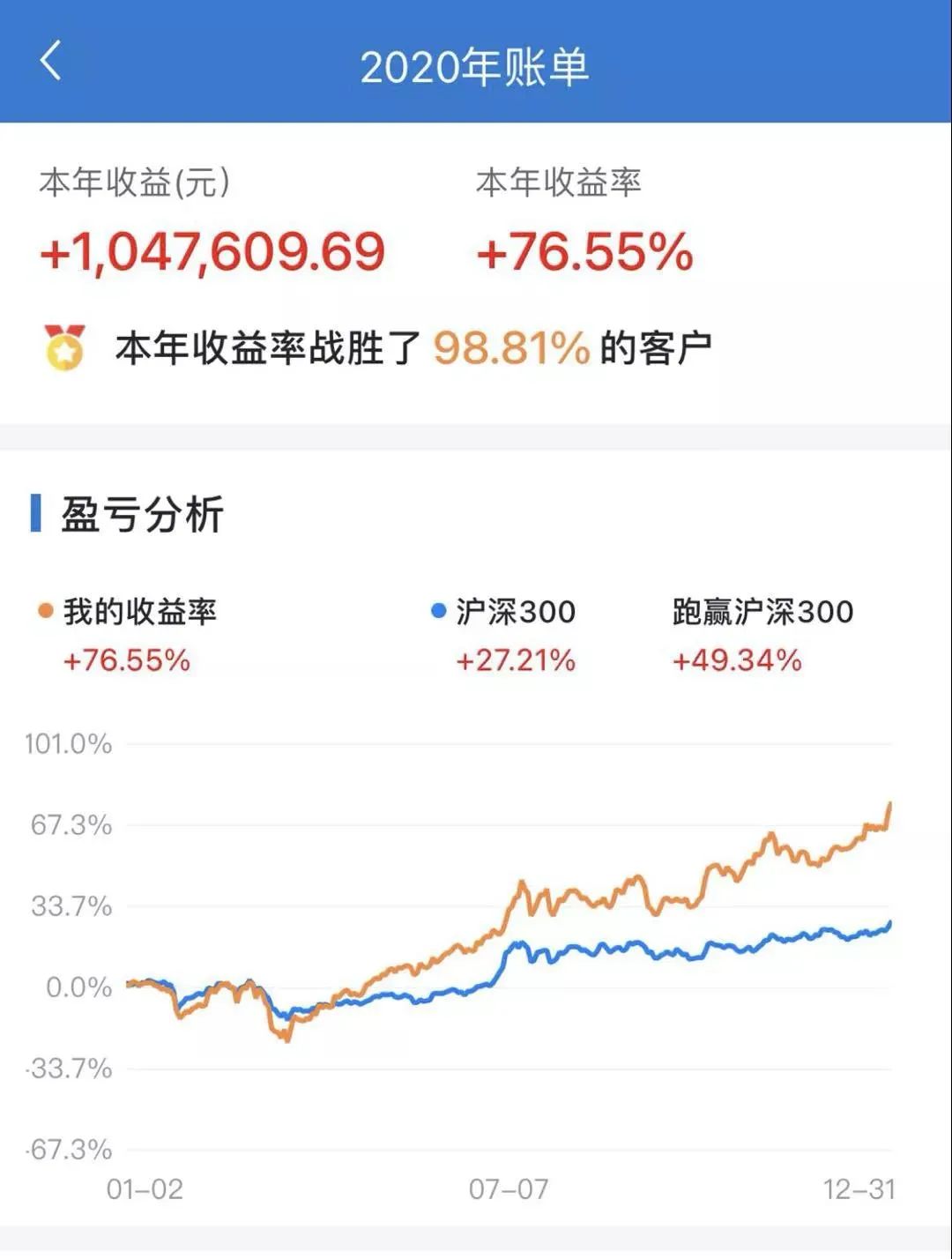 我今年22岁,是一名大四学生。刚刚过去的2020年,我的投资组合收益率(仓位有20只股票)达到76%,赚到了人生的第一个100万。做投资的4年里,从年收益率来看的话还没亏过。