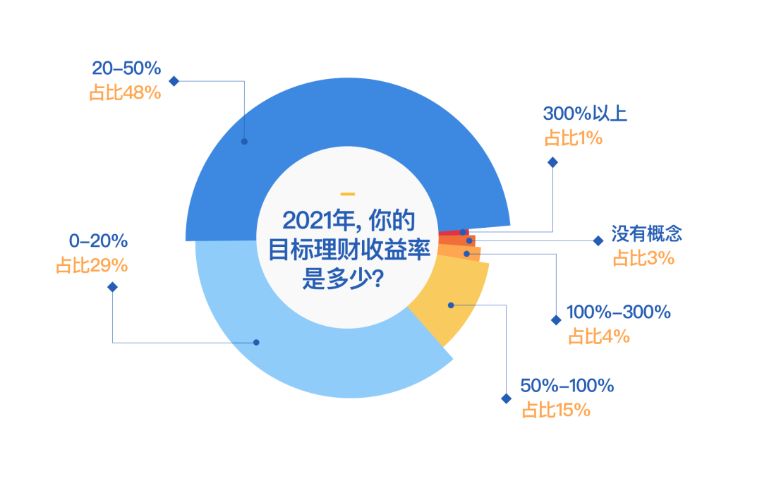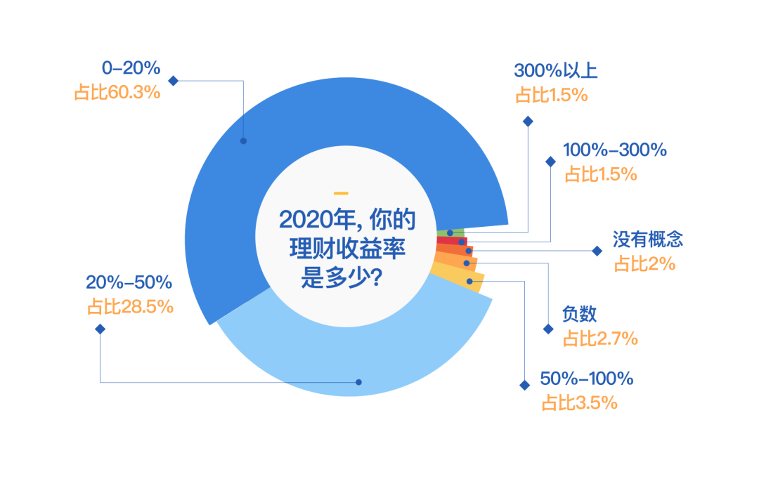 喊了一整年的暴富梦,年轻人2020收益率怎么样呢?调查显示,60.3%的年轻人年收益率在0-20%,28.5%的年轻人收益率在20-50%,还有5%左右的年轻人对收益率没有概念或者是负数。