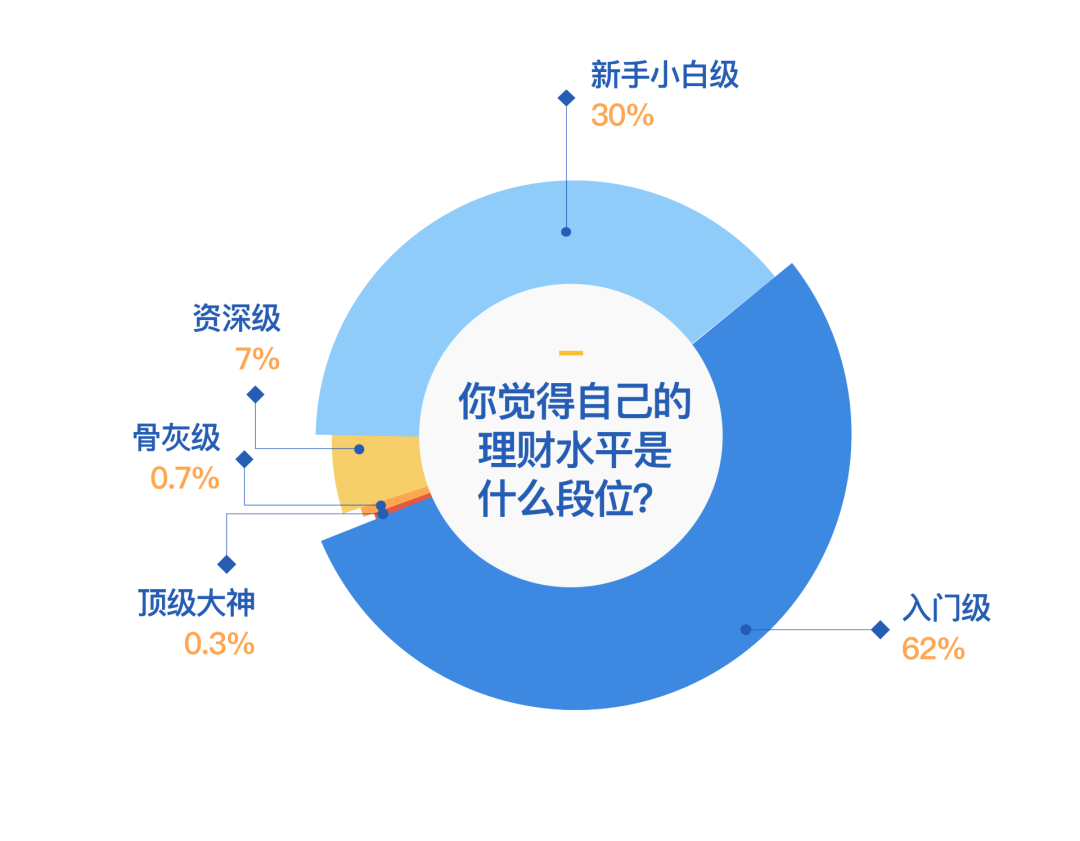 对于自己的理财水平,大部分年轻人表现得很“谦虚”。62.8%的年轻人觉得自己的水平只是入门级,30%的年轻人认为是新手小白级,自认为是资深级的年轻人不到7%,骨灰级和顶级大神级的更是不到1%。