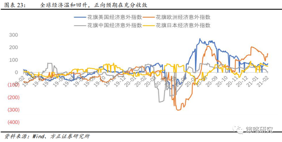 国内经济复苏的势头有所放缓,海外经济加速复苏。国内经济方面,1月PMI回落0.6个百分点至51.3,大部分分项指数均回落,但库存有所回升,表明需求回落的幅度大于生产回落的幅度,“就地过年”对生产的拉动效应可能不如之前市场预期的乐观,对经济影响可能整体偏负面。从1月的高频数据来看,生产端开工率相比于去年11月份峰值均有下降,但较12月低点有所回升。需求端方面,1月汽车和地产销量均维持较高增速。总体而言,1月经济相较于去年11月的峰值有所回落。从海外经济来看,美国经济复苏势头强劲,美国1月PMI继续扩张,ECRI领先指标加速上升,十年期国债收益率逼近1.2%,疫苗接种范围扩大之后,疫情数据明显好转。此外,韩国出口连续两个月维持在10%以上的增速,亦表明全球经济处于加速恢复的趋势之中。