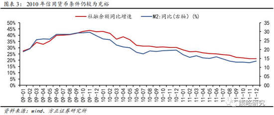 2010年经济周期位于V型反转后的高位企稳阶段,货币信用相对充裕。2010年全年经济基本延续了2009年以来的复苏趋势,受到基数因素影响,经济增速在2010Q1达到峰值(12%),随后虽有所下滑但基本保持在10%左右的增速,全年增速达到10.6%,整体呈现高位企稳的特征。2010年经济改善的驱动力来自于外需以及地产投资。出口在金融危机担忧消除后大幅改善,由2009年底的-16%反弹至2010年底的31%;地产投资再上台阶,弥补了基建投资增速下滑的空缺,制造业投资则基本持平,维持在26%左右的增速。2010年货币政策处于紧缩的开端,在四季度通胀抬头后陡然加码。货币政策在2010年开始试探性紧缩,标志是1月18日央行上调存款准备金率,政策超预期早调。7月温总理在调研时释放政策由压转保的信号,货币政策紧缩放缓。10月份开始央行紧缩政策陡然加码,四季度央行加息两次,上调存款准备率3次。流动性方面,从社融来看,2010年社融规模同2009年的天量社融基本持平,融资需求旺盛;从货币供应量来看,2010年全年M2增速前高后低,由年初的26%下移至年底的20%,全年维持在较高水平;总体而言,虽然2010年货币政策开始收紧,但2010年流动性仍然保持较为充裕的状态。