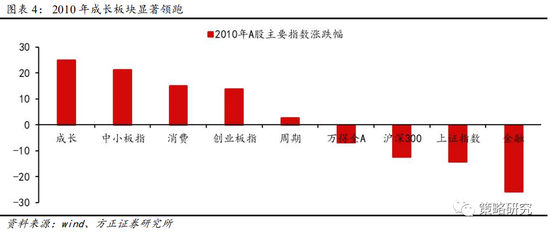 2、2010年宏观经济位于V型反转后的高位企稳阶段,货币信用环境在Q4出现明显转向。估值调整和业绩修复是市场进入震荡格局的主要逻辑,在此背景下成长板块跑出长牛,全年电子、医药生物、机械设备领涨。