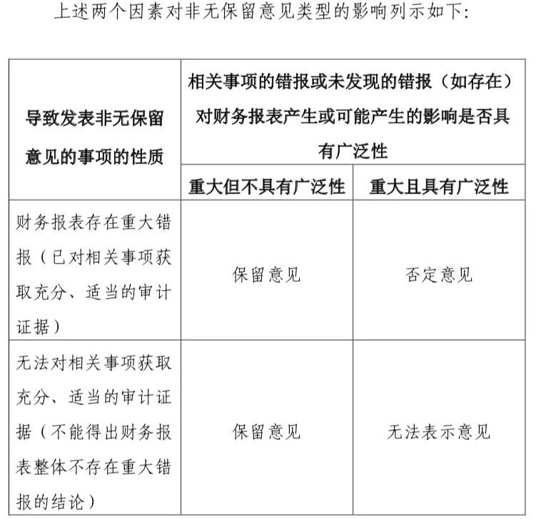 根据券商中国记者梳理,比如对于“注册会计师如何确定恰当的非无保留意见类型”的问题上,中注协解释,注册会计师在确定恰当的非无保留意见类型时,需要考虑下列因素: