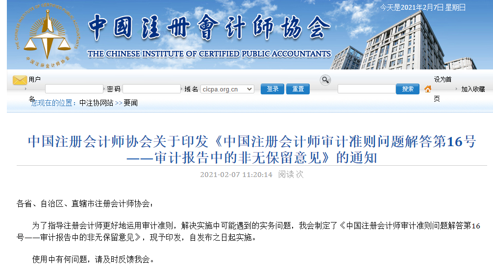 2月7日,中注协表示制定了《中国注册会计师审计准则问题解答第16号——审计报告中的非无保留意见》(以下简称问题解答),并于2月2日发布施行。