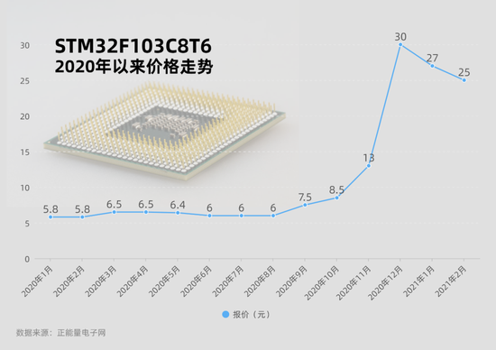 一款很火的微控制器“STM32F103C8T6”,能够为大家展示MCU乃至汽车芯片的缺货情况、涨价幅度,以及最重要的数据——涨价开始的时间和峰值。