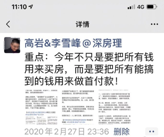 由知情人展示的“深房理”在2020年2月发布的微信朋友圈显示,“重点:今年不只是把所有钱用来买房,而是要把所有能稿到的钱用来做首付款!”