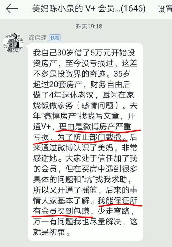 “深房理”如此介绍自己:“我自己30岁借了5万元开始投资房产,至今没亏损过,这差不多是投资界的奇迹。35岁超过20套房产,财务自由后,做了4年退休老汉,赋闲在家烧饭做家务。……我能保证所有会员买到包赚,少走弯路,万一有问题我也尽量解决”。