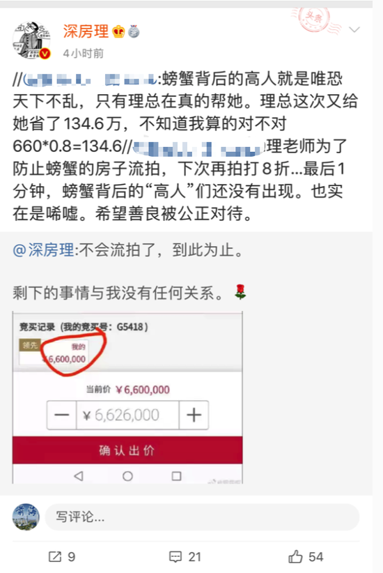 “深房理”在微博对“蟹姐姐”房产拍卖表态。