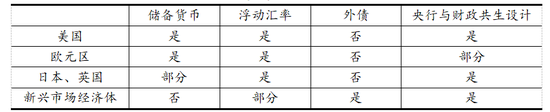 按照上述逻辑,美国拥有理想的货币体系,是储备货币,采用浮动汇率、无外债,央行与财政是共生设计。欧洲货币联盟(EMU)的货币体系设计是不完整的,欧元是一个储备货币,没有外债和浮动汇率,但中央银行对欧元区任何一个经济体来说本质上是一个“国外”实体,而且欧元区没有统一的财政部。日本、英国等的货币体系设计也是不完整的,因为只有部分储备货币的功能。当然,按照这一逻辑,新兴市场经济体的货币体系设计也同样是不完整的,不是储备货币(或者储备货币的占比过低),汇率也是部分浮动汇率,而且存在外债。