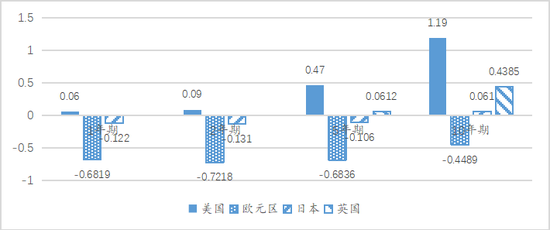 从国债收益率来看,同样如此。全球无风险利率被压低在极低的水平,尤其是欧洲债券出现了大规模的负收益率债券。图3显示了欧元区国债1-10年期限的收益率均是负值;日本1-5年期限的国债收益率也是负值,只有10年期国债勉强是正收益率(0.061%);英国只有5年期和10年期的数据,均为正值,但收益率很低。相比之下,美国国债收益率均为正收益率,尽管收益率不高,但在主要发达经济体中,其国债的收益率还是有明显优势的。比如10年期限国债收益率达到1.19%,相比2020年5月份的低点0.54%来说,已经上涨了一倍。