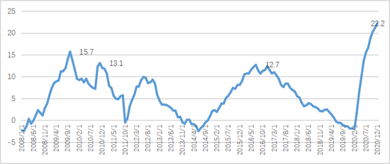 由于货币制度体系的设计,欧洲央行不会直接购买欧元区经济体政府为财政赤字发行的债券,换言之,欧洲央行不会直接实施财政赤字的货币化。但欧洲央行通过另外一种方式去配合欧元区经济体政府的融资,通过政府信贷为政府提供资金。图4显示了次贷危机以来,欧洲央行发放政府信贷的增长率变化,每一次的高点都和危机有关。次贷危机时期以及次贷引发的欧债危机出现了图中的15.7%和13.1%的高增长率;2016年也是南欧政府债务问题导致了12.7%的信贷增长阶段性高点;2020年新冠肺炎疫情爆发,欧洲央行的政府信贷增长率快速上升,2020年12月份的政府信贷增长率年率高达22.2%。