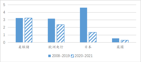 2020年新冠肺炎疫情的冲击,上述央行的资产负债表进一步快速扩张。在短短的差不多1年的时间,美联储扩表了3.24万亿美元,基本等于过去12年扩表的总和;欧洲央行也扩表了2.36万亿欧元。日本央行和英国央行此次扩表的规模要小得多,主要是经济体量无法与美国和欧元区相比,分别大约扩表了1.36百万亿日元和0.31万亿英镑,但相对于经济体量来说,其扩表的程度并不低。因此,全球主要国际货币的央行存在明显的竞争性扩表行为。