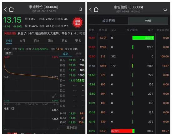 今日,泰坦股份以涨停价开盘,但之后直线下跌,9:31:18,泰坦股份便被砸至跌停,之后便一直跌停。截至收盘,泰坦股份跌停板上的封单为10.8万手,全天成交1.1亿元,市值为28.4亿元。其中涨停价16.07元成交了3.3万手,成交额为5303.1万元,而这3.3万手今日浮亏963.6万元。在今日开板前一交易日的2月5日,泰坦股份仅成交了484万元。