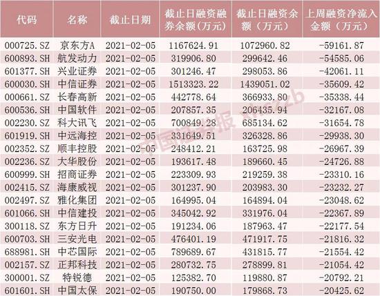 从个股情况来看,Choice数据显示,截至2月5日,上周5个交易日,京东方A、航发动力、兴业证券融资净卖出金额居前,分别净卖出5.92亿元、5.46亿元、4.21亿元。