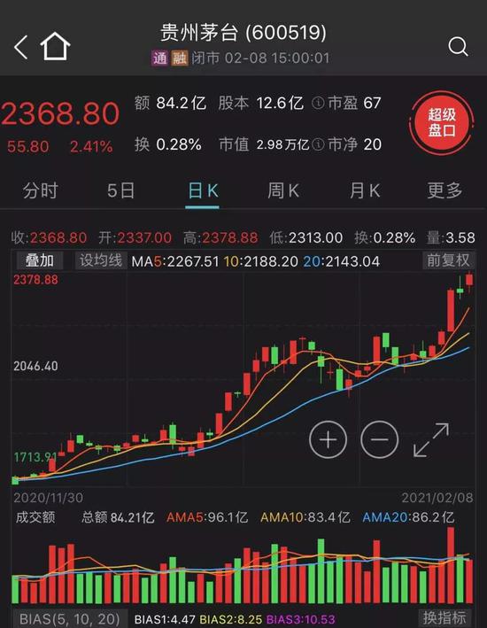 此外,中国中免、贵州茅台、片仔癀、爱尔眼科、万华化学等多只抱团股今日创下历史新高。其中贵州茅台上涨2.41%,报2368.80元/股,市值达2.98万亿元。