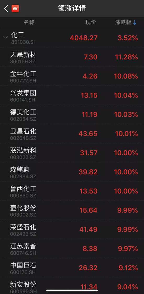 化工行业上演涨停潮,天晟新材涨逾11%,金牛化工、兴发集团、德美化工、卫星石化等10只个股涨停。