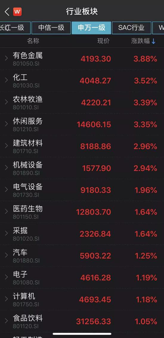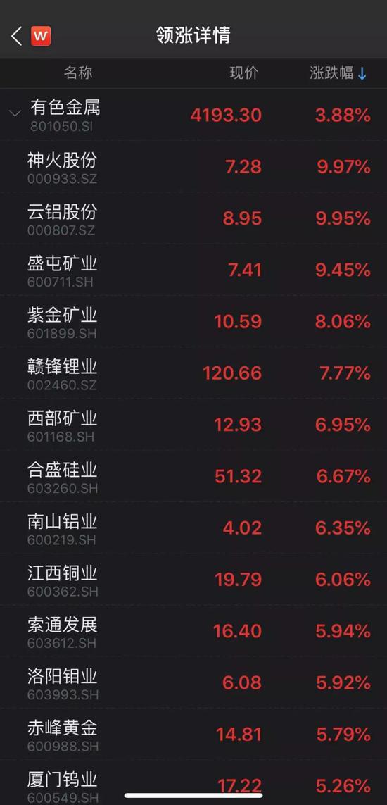 有色金属行业中,神火股份、云铝股份涨停,盛屯矿业涨逾9%,紫金矿业涨逾8%,赣锋锂业涨逾7%。