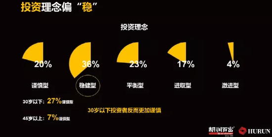 从投资风险偏好角度来看,高净值人群风险偏好在降低。36%的高净值人群持“稳健型”投资理念,23%为“平衡型”,20%为“谨慎型”,17%为“进取型”。从年龄分布来看,30岁以下群体更为谨慎,45岁以上群体更为进取。