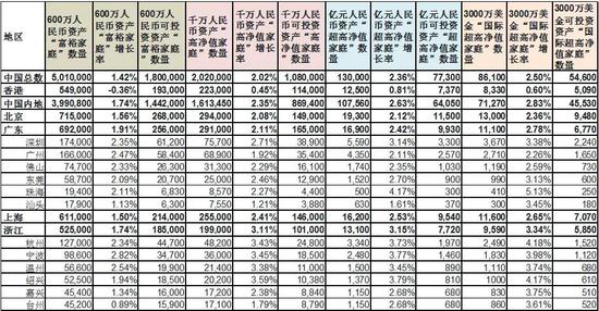 中国拥有600万人民币资产的“富裕家庭”数量已经达到501万户,比上年增加7万户,增长率为1.4%,其中拥有600万人民币可投资资产的“富裕家庭”数量达到180万户;拥有千万人民币资产的“高净值家庭”数量达到202万户,比上年增加4万户,增加2%,其中拥有千万人民币可投资资产的“高净值家庭”数量达到108万户;拥有亿元人民币资产的“超高净值家庭”数量达到13万户,比上年增加3,000户,增加2.4%,其中拥有亿元人民币可投资资产的“超高净值家庭”数量达到7.7万户;拥有3000万美金的“国际超高净值家庭”数量达到8.6万户,比上年增加2,100户,增加2.5%,其中拥有3000万美金可投资资产的“国际超高净值家庭”数量达到5.4万户。