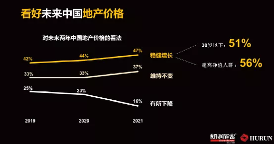 《财富报告》显示,住宅投资依旧是高净值人群未来三年最青睐的投资方向,15%的高净值人群选择在未来三年增加住宅投资,但该比例较去年的23%下滑8个百分点。47%的高净值人群认为未来两年国内地产价格将稳健增长,较去年增加3个百分点,37%认为将维持不变,16%认为将有所下降,较去年减少7个百分点。