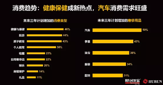从消费类型来看,高净值人群对于健康的关注度持续上升。46%的高净值人群选择未来增加健康保健方面的消费,排名首位,之后分别是旅游(44%)、孩子教育(43%)、个人教育(36%)收藏(23%)。