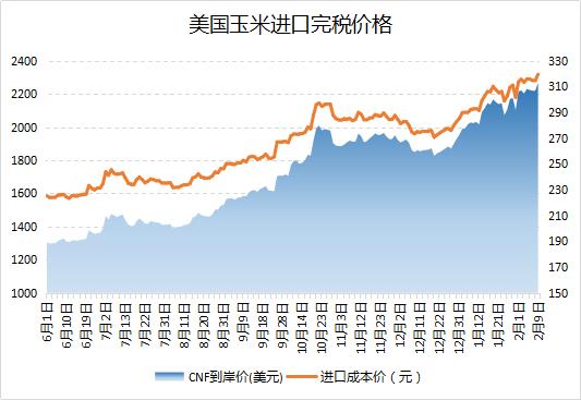 USDA供需报告预期利好,且巴西玉米种植可能延误的担忧也提振市场,CBOT玉米升至七年半高位,进口成本再上新高。2月9日美国玉米进口到岸价为312.81美元,较上日涨6美元,进口成本价为2318.63元,较上日涨37.21元,刷新阶段新高。