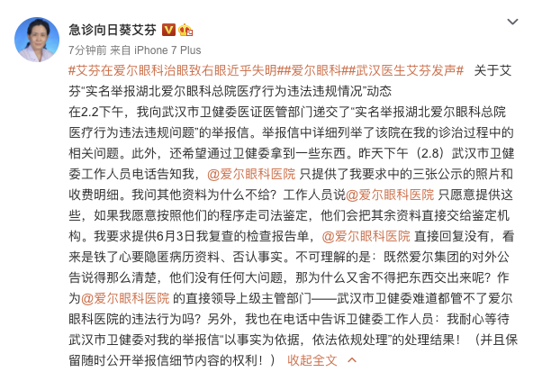 2月9日上午,武汉抗疫医生艾芬在爱尔眼科治眼后出现视网膜脱离右眼近乎失明一事继续发酵。艾芬在其个人微博发文称,在2月2日下午,其向武汉市卫健委医证医管部门递交了“实名举报湖北爱尔眼科总院医疗行为违法违规问题”的举报信。举报信中详细列举了该院诊治过程中的相关问题。