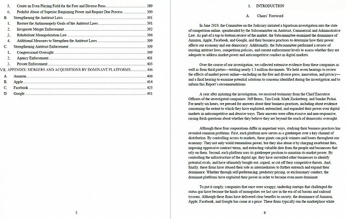 小组委员会根据大量事实生成这份报告,其中包括1,287,997份文档和通讯记录;38位证人的证词;跨越1,800多页的听证记录;来自各个政治领域的60位反托拉斯专家提交了38篇论文;以及对240多个市场参与者、被调查平台的前员工以及其他个人的采访,总计耗时数千小时。
