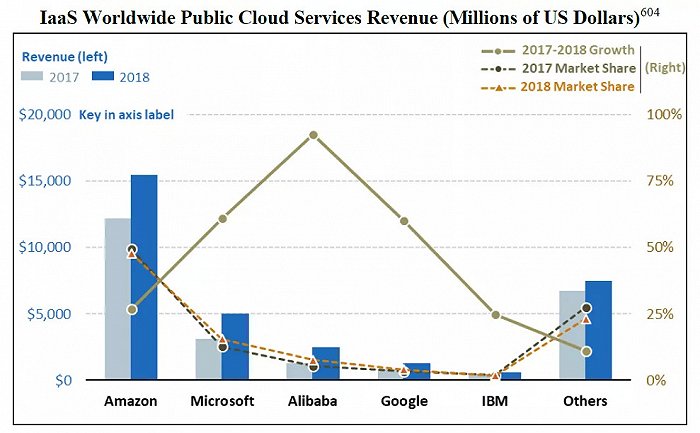 Amazon作为云平台龙头,在云计算市场占据支配地位。根据Gartner的数据,全球IaaS市场从2017年的247亿美元增长到2018年的324亿美元,同比增速为31.3%。如下图所示,AWS无疑是云计算基础设施市场的领导者,其市场份额是Microsoft的三倍。阿里巴巴、Google和Microsoft的增长速度是Amazon的两倍。Gartner预计,IaaS全球公有云服务收入的增长速度将超过任何其他板块,2022年将达到766亿美元。