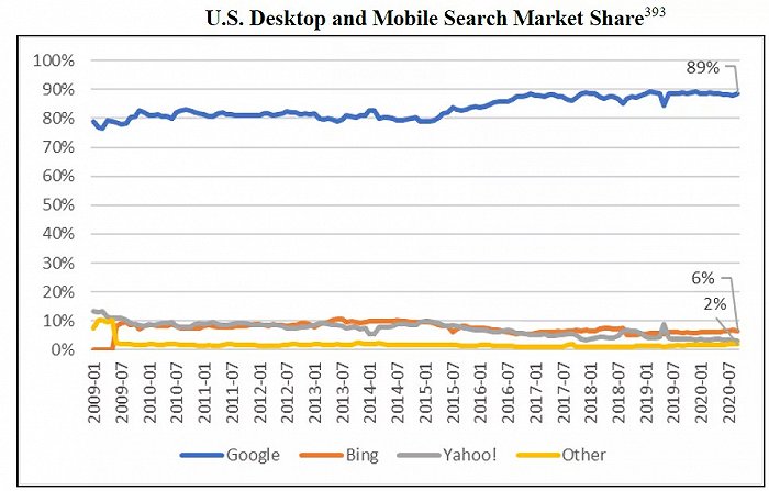 Google在通用在线搜索(general online search)和搜索广告市场上处于垄断地位。Google的市场支配地位源自于其高进入壁垒,这其中包括点击和查询数据(click-and-query data)以及Google在全球大多数设备和浏览器上广泛取得的默认安装地位。