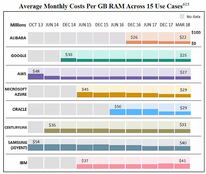 如下图所示,IaaS的价格随着时间的推移而下降,根据RBC Capital Markets 2018年的一份报告,这三家美国主要提供商的服务定价低于30美元/GB RAM。市场参与者将这种趋势解释为云服务提供商具备规模经济效应以及更关注从PaaS和SaaS产品中增加收入,而非更关注从IaaS产品获得收入。