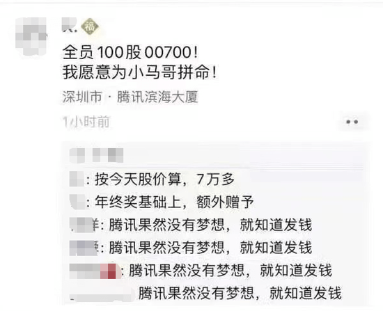 如果按照现价计算,100 股腾讯股票市值在 7.4 万港元左右,折合人民币 6.1 万元左右。此外,入职未满一年的员工也可拿到这份奖励,有在去年 12 月入职的员工也收到了通知。
