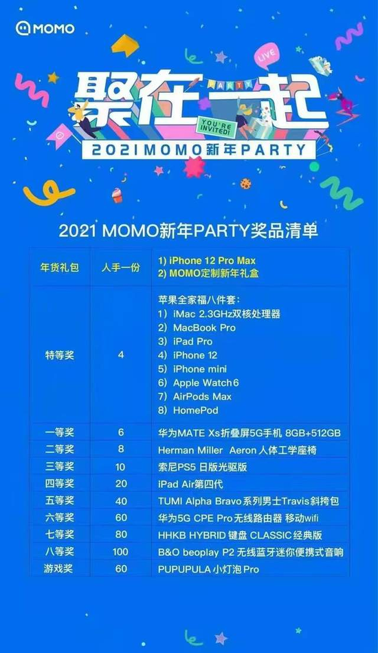 雷锋网也了解到,陌陌去年的年会奖品是人手一台 iPhone 11 256GB 以及一副 AirPods Pro。不仅如此,陌陌还曾在年会发放了高达数千万元奖金,仅阳光普照大奖就发放给每人 25000 现金。