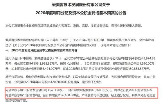 忽略此前沃特股份仅发布一日就匆匆撤回的“10转7派1”高送转提议,爱美客系2021年高送转第一股。爱美客的分红金额约占2020年净利润的96%。