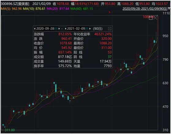 爱美客发行价为118.27元,上市首日收盘价340.1元,涨幅达187%。此后,股价一路上涨、屡创新高,当前价格较IPO价格累计涨逾812%。