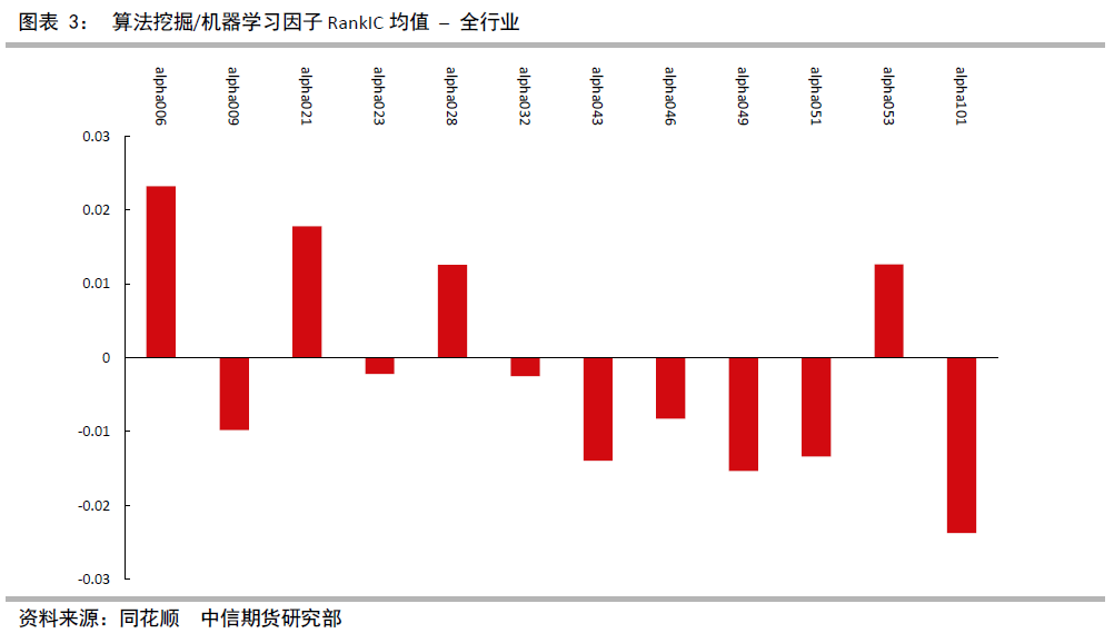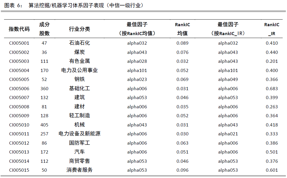 使用中信一级行业分类,本文接着计算基于算法挖掘/机器学习因子体系的单因子RankIC和RankIC_IR值。可以发现,不同行业的最佳因子,无论是按RankIC还是按RankIC_IR,均差异明显。这亦可能是由于不同行业间上市公司本身特质差别较大,将单一因子均匀的应用于全市场选股会具有较大的风险。