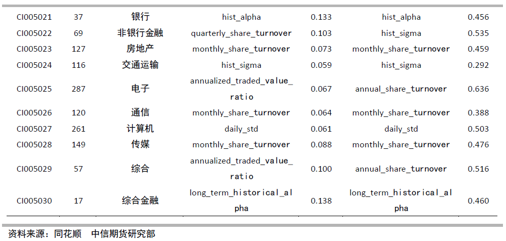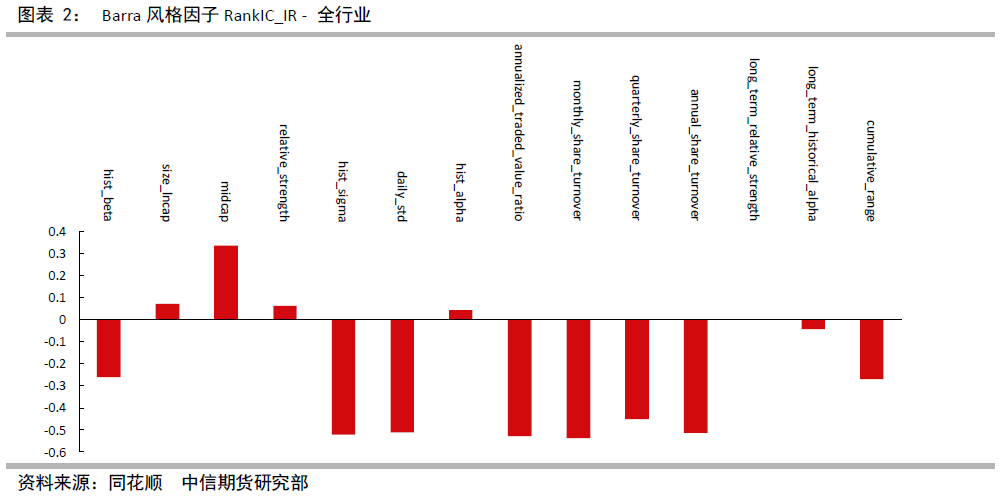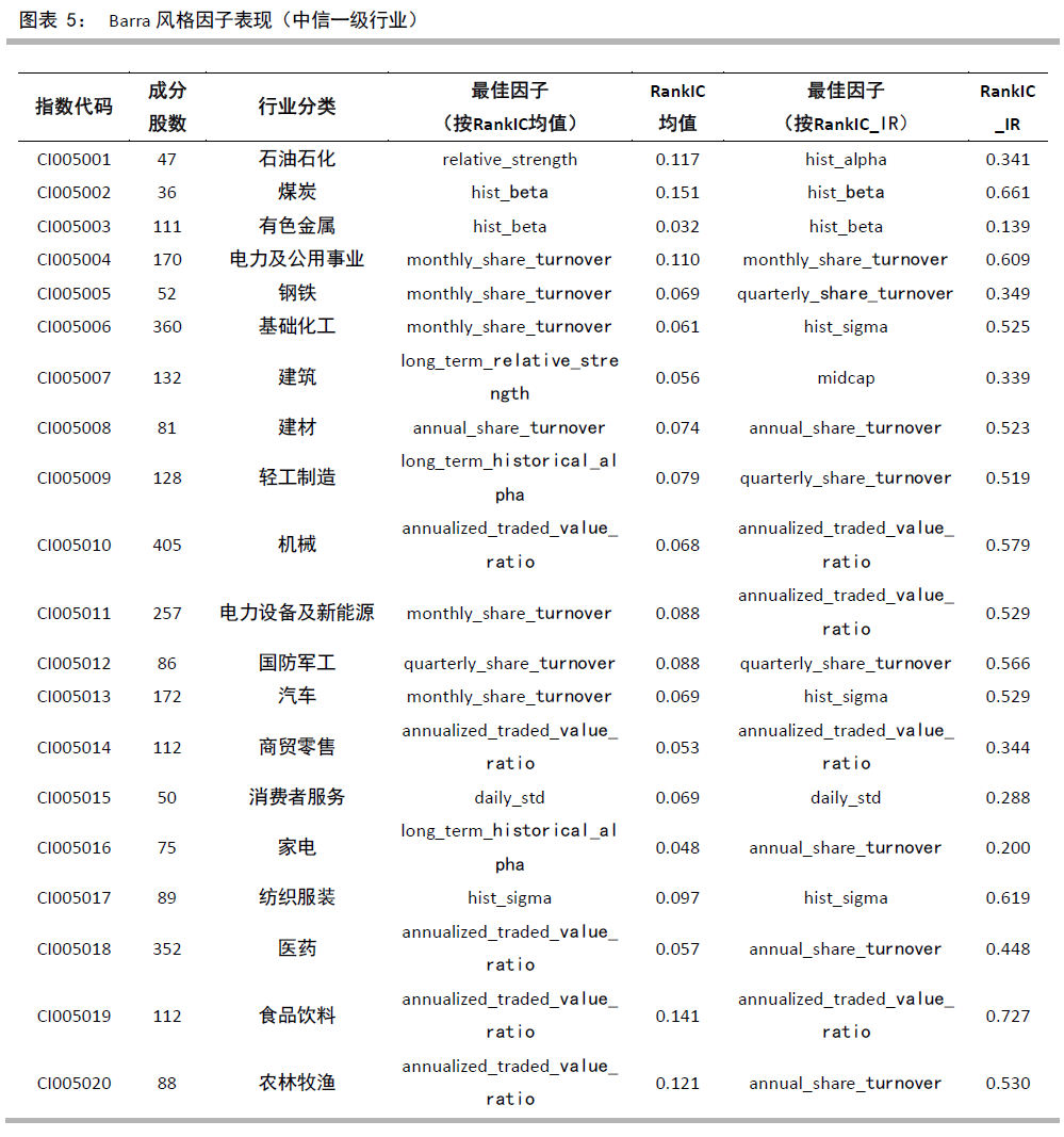 使用中信一级行业分类,本文首先计算基于Barra风格因子体系的单因子RankIC和RankIC_IR值。可以发现,不同行业的最佳因子,无论是按RankIC还是按RankIC_IR,均差异明显。这可能是由于不同行业间上市公司本身特质差别较大,以此导致的上市公司权益回报率对因子的敏感性的天差地别。