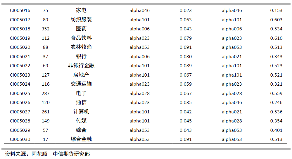 中信一级行业的因子表现:按照中信一级行业分类方法,共分30个行业,在每个细分一级行业中,使用最近一周的日频数据,计算并展示Barra风格因子体系和算法挖掘/机器学习因子体系中单因子的表现。在表现最好的消费者服务行业中,Barra 体系内daily_std(日收益率标准差,按RankIC 均值和RankIC_IR均是)表现最好,算法体系内alpha053(反转类,按RankIC均值和RankIC_IR均是)表现最好;在表现最差的综合金融行业中,Barra体系内long_term_historical_alpha(长期历史alpha,按RankIC均值和RankIC_IR均是)表现最好,算法体系内alpha053(反转类,按RankIC均值和RankIC_IR均是)表现最好。