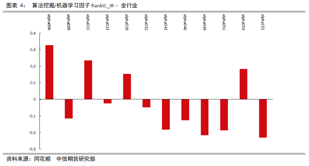 使用近一周的数据回测,按因子RankIC均值,算法挖掘/机器学习因子里面选股能力最佳的是alpha101;按因子RankIC_IR,算法挖掘/机器学习因子里面选股能力最佳的是alpha006。